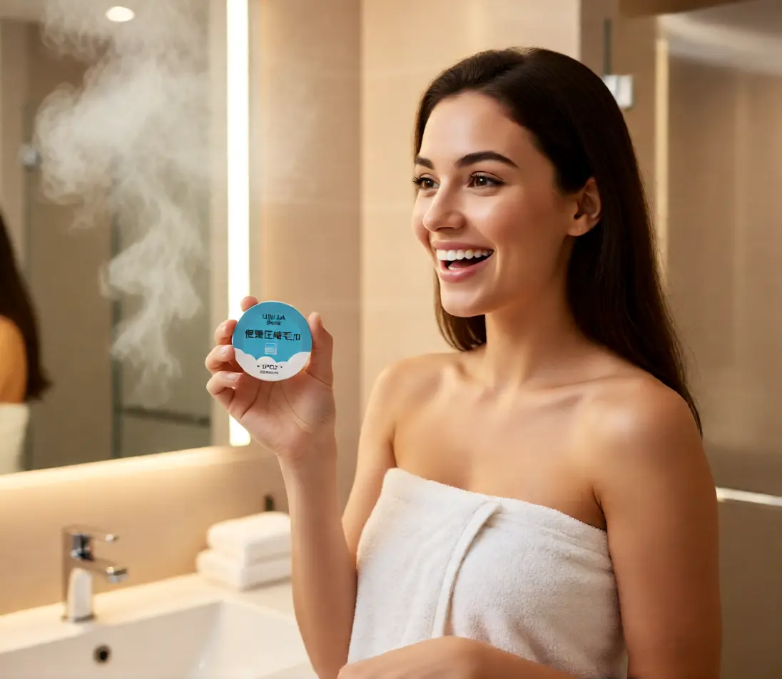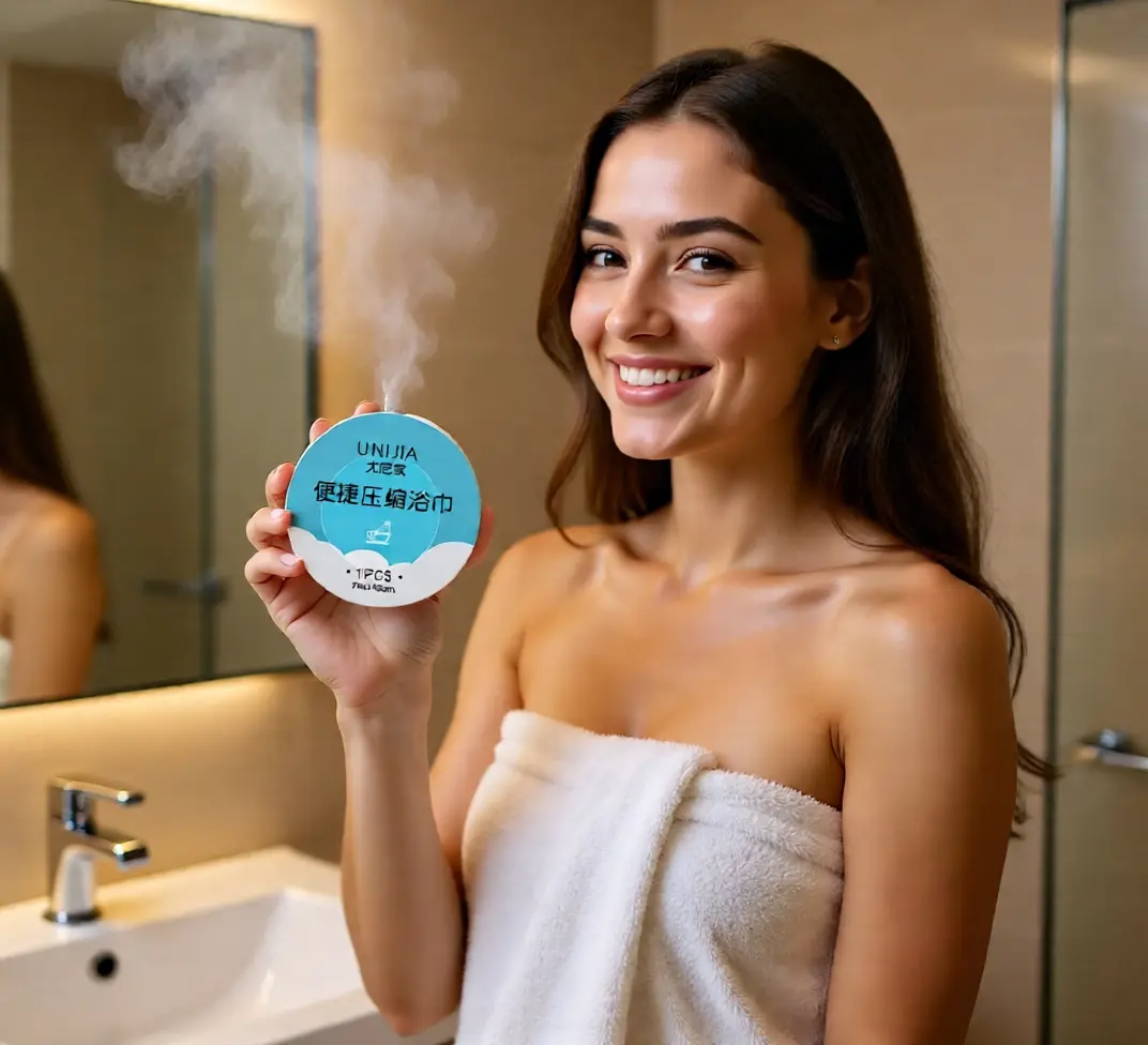 This compressed, single-use bath towel expands instantly with water into a full-size, luxuriously soft towel. Designed for everyone who wants comfort, cleanliness, and convenience without the bulk or laundry.